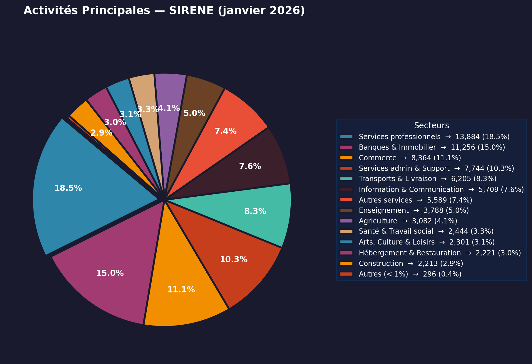 Découvrez gratuitement comment évoluent les entreprises en France. SirenScope récupère les données brutes de l’API Sirene et vous les présente de façon claire : créations, fermetures, tendances par secteur. Observez rapidement ce qui s’est passé ce mois-ci avec un résumé des nouvelles données : créations, fermetures, secteurs dynamiques et tendances entrepreneuriales.
