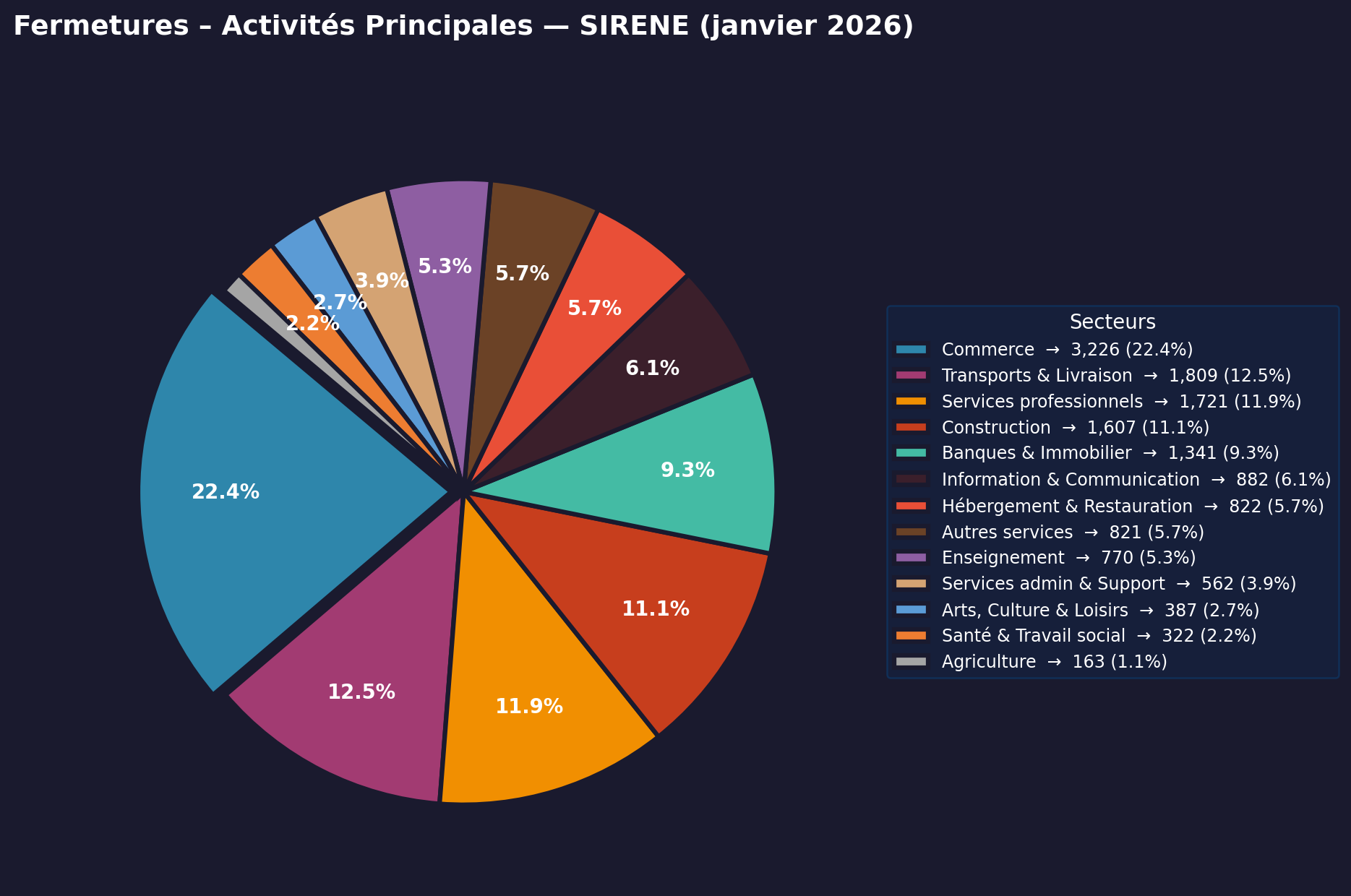 Observez la composition par secteur des fermetures et ouvertures pour voir ce qui intéresse le plus les entrepreneurs français. Ces camemberts révèlent les tendances dominantes du marché : quels secteurs attirent les créateurs d’entreprises et lesquels connaissent le plus de fermetures. Pour observer le détail des activités, nos données sont disponibles en graphique interactif sur les pages détaillant les données d’entreprises.